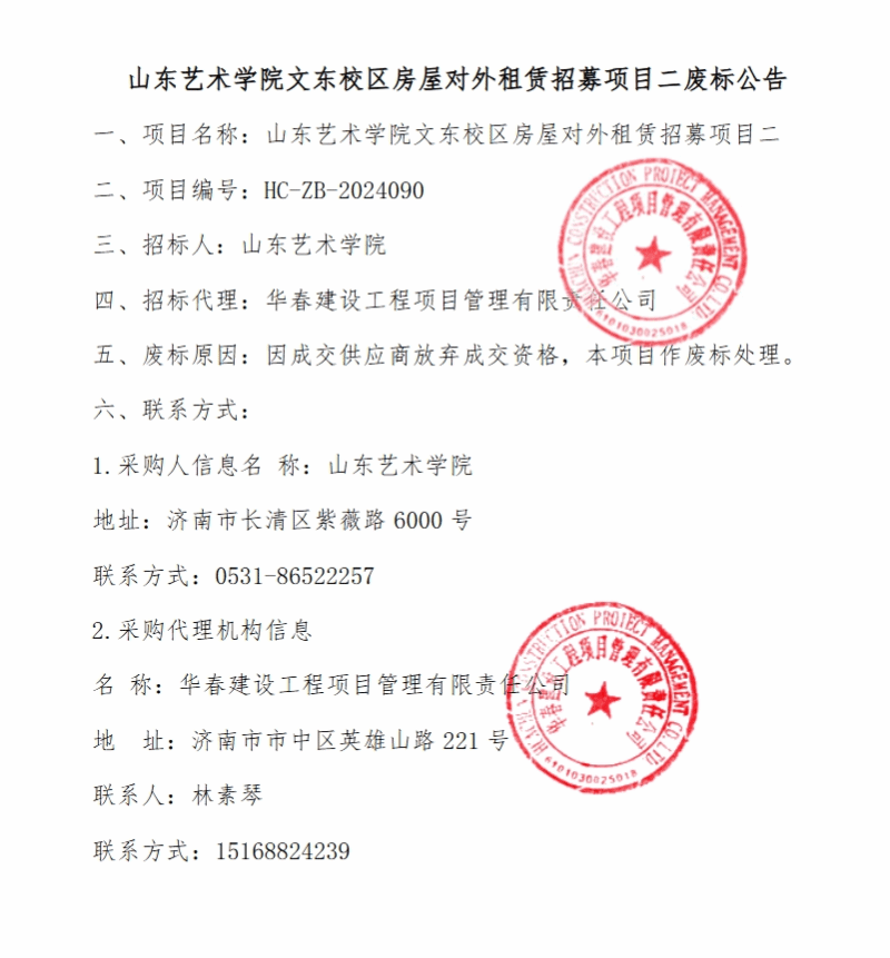 山东艺术学院文东校区房屋对外租赁招募项目二废标公告