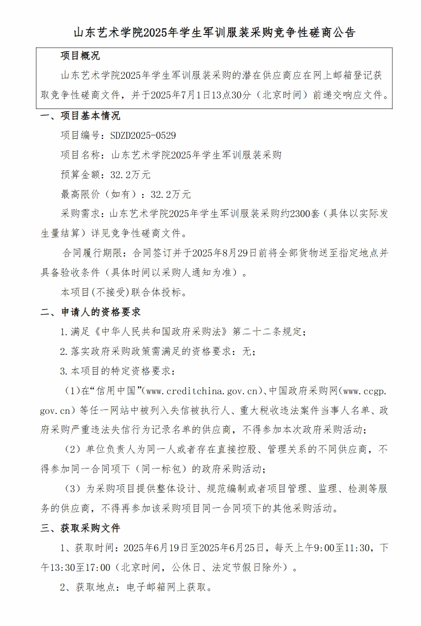 相关链接:https://ctbpsp.com/#/bulletinDetail?uuid=db2ad021-2f6b-43a7-ad45-e27c6ab8ef9a&inpvalue=%E5%B1%B1%E4%B8%9C%E8%89%BA%E6%9C%AF%E5%AD%A6%E9%99%A22025%E5%B9%B4%E5%AD%A6%E7%94%9F%E5%86%9B%E8%AE%AD%E6%9C%8D%E8%A3%85%E9%87%87%E8%B4%AD&dataSource=0&tenderAgency=