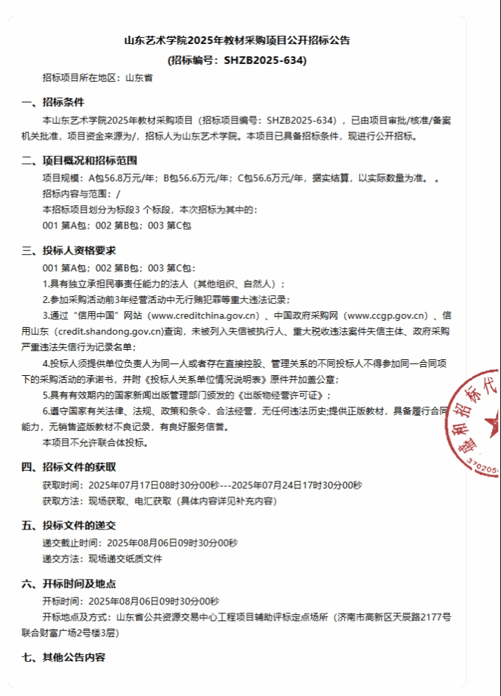 相关链接:https://ctbpsp.com/#/bulletinDetail?uuid=e5276de7-bc41-4652-b63a-44e78e74137b&inpvalue=%E5%B1%B1%E4%B8%9C%E8%89%BA%E6%9C%AF%E5%AD%A6%E9%99%A22025%E5%B9%B4%E6%95%99%E6%9D%90&dataSource=0&tenderAgency=