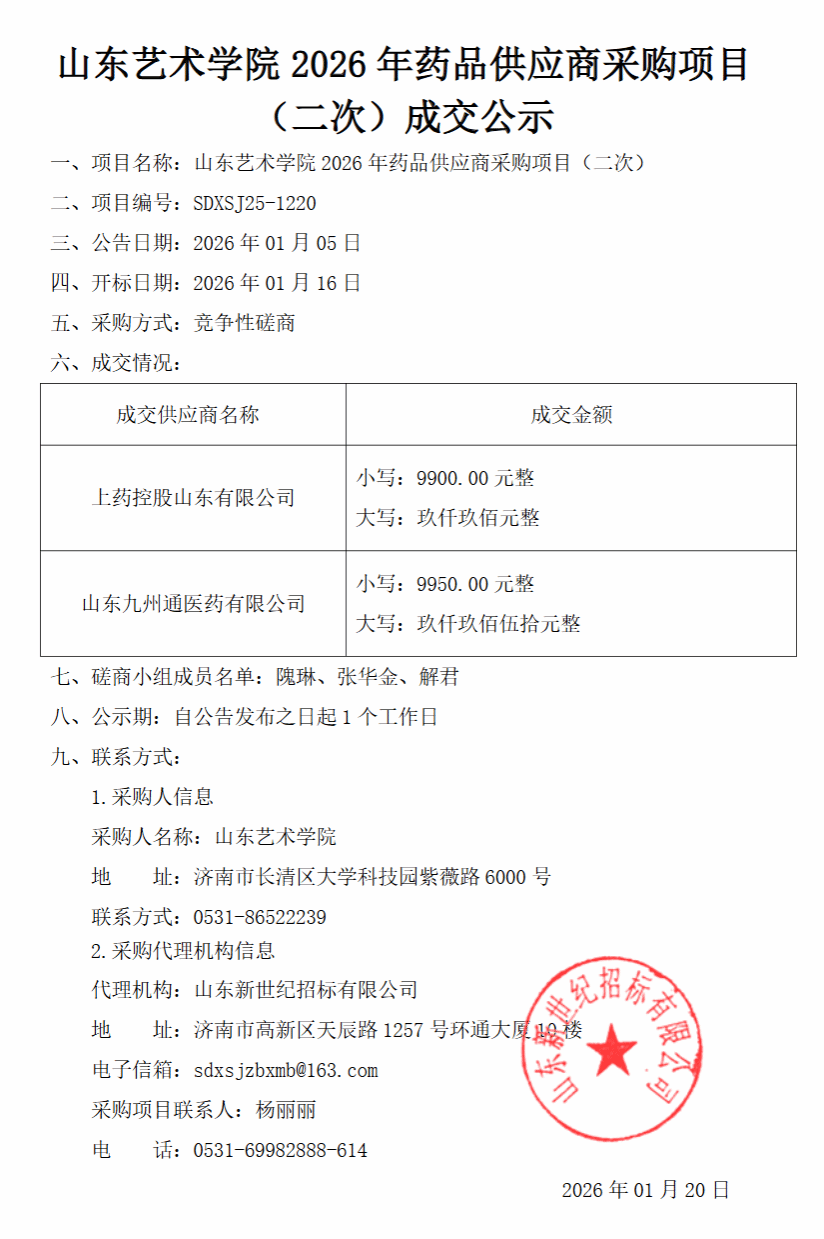相关链接:https://ctbpsp.com/#/bulletinDetail?uuid=54f64208-4279-4881-8b2a-35e2be13ea79&inpvalue=%E5%B1%B1%E4%B8%9C%E8%89%BA%E6%9C%AF%E5%AD%A6%E9%99%A22026%E5%B9%B4%E8%8D%AF%E5%93%81%E4%BE%9B%E5%BA%94%E5%95%86%E9%87%87%E8%B4%AD%E9%A1%B9%E7%9B%AE%EF%BC%88%E4%BA%8C%E6%AC%A1%EF%BC%89&dataSource=0&tenderAgency=